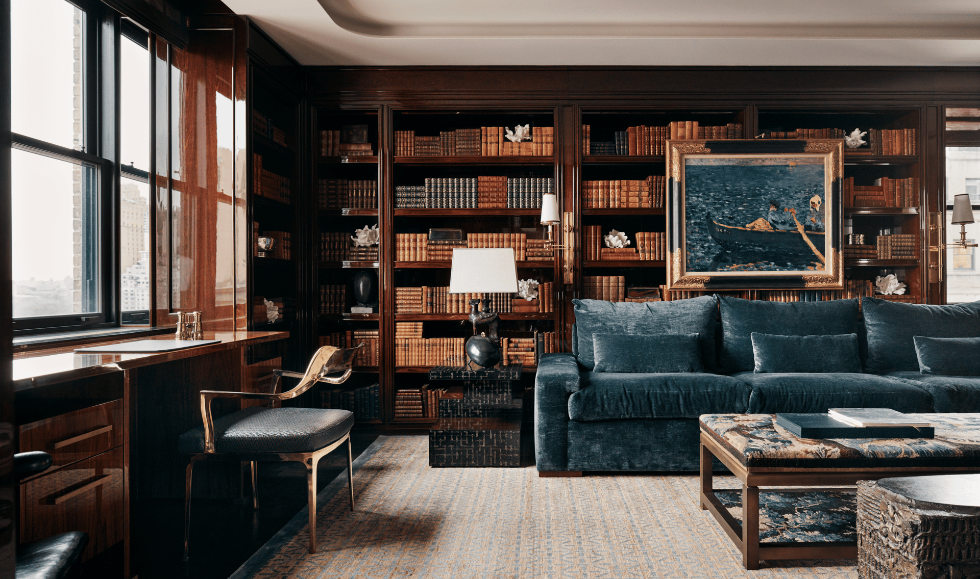 The Luxe Urban Expansion library embodies tradition and grandeur. A moody palette of deep teal and warm wood sets a sophisticated tone, while shelves lined with antique books and first editions enhance its sense of history. A curated mix of contemporary, vintage, and antique furnishings creates a timeless atmosphere, evoking the past yet designed for modern living. By the window, a desk with a leather writing pad provides an elegant workspace with a view overlooking Central Park.