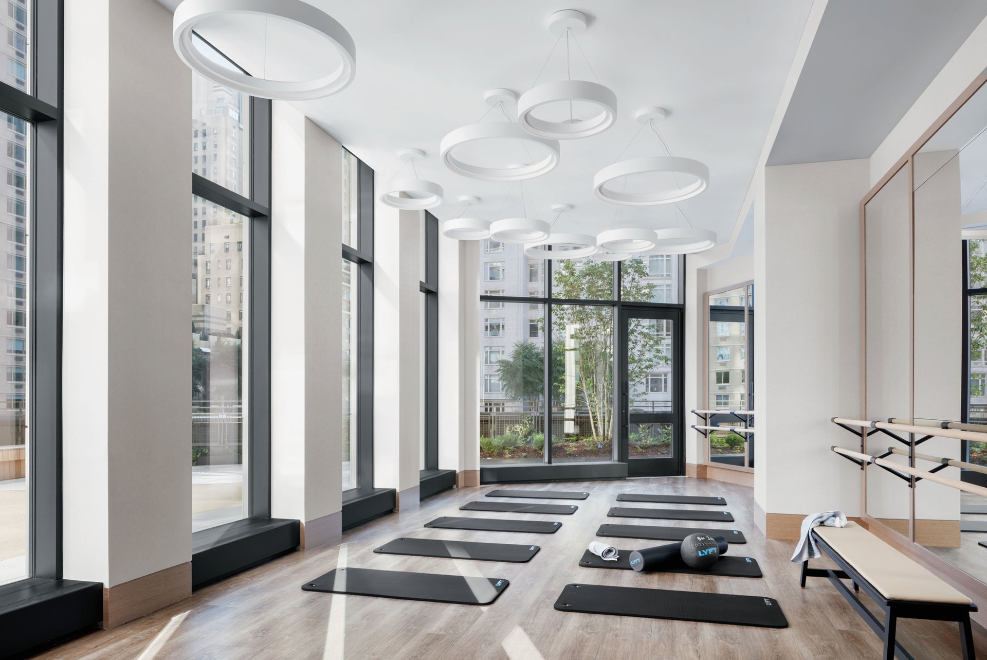 While traditional gyms with cardio machines and free weights have long been standard, there is growing demand for more versatile fitness spaces. The Park Loggia’s light-filled exercise studio meets this need with a setting designed for yoga, barre, Pilates, and aerobics. Airy and invigorating, the studio encourages residents to embrace wellness within the comfort of their own building.
