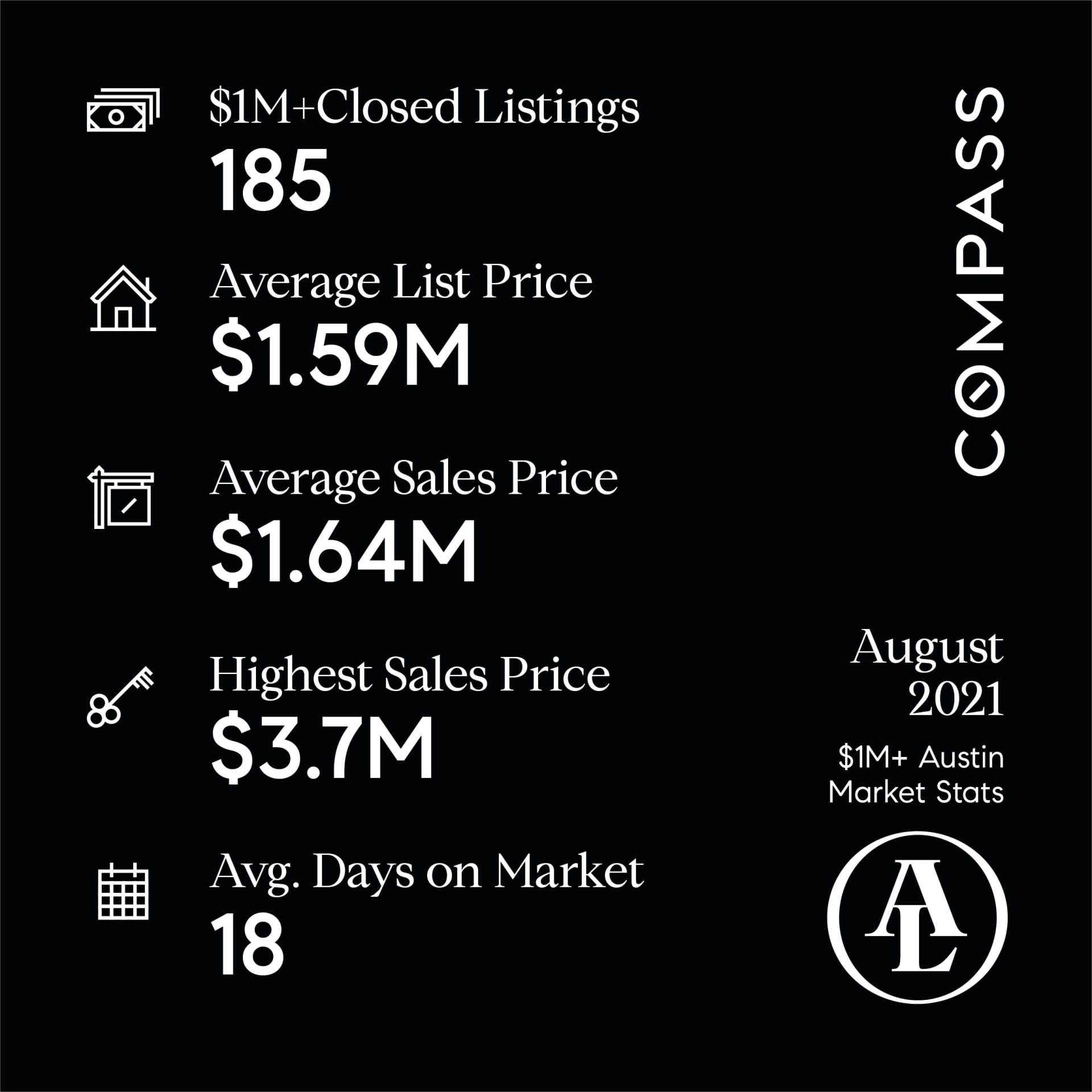 Austin's $1M+ Real Estate Market Stats August 2021: While the Austin market saw some slight stabilization over the summer, luxury homes are still in high demand. Average days on market for August 2021 was 18, compared to 50 days on market just a year ago! Interested in what you can buy or sell for? We would love to partner with you on helping you to maximize your investment! Give us a call today to discuss how we service our clients along with recommendations on the best timing, price, and terms.
