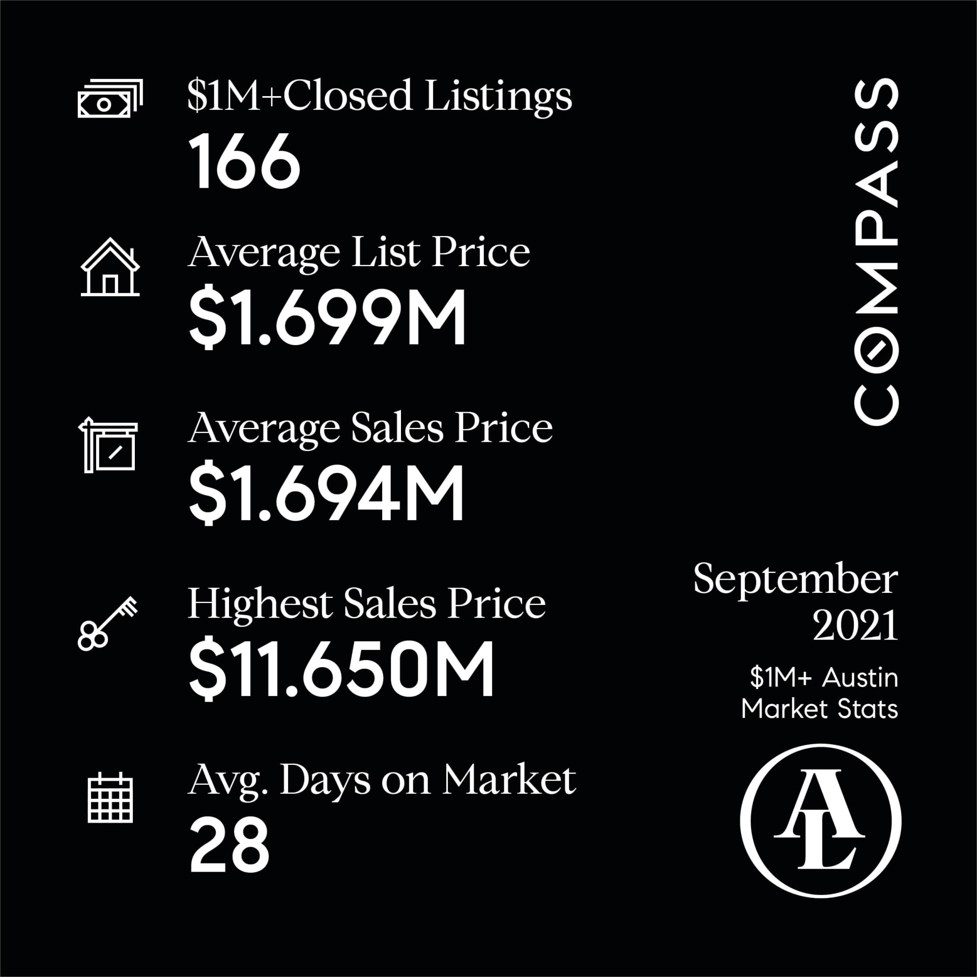Austin's $1M+ Real Estate Market Stats September 2021: Luxury home sales remain strong; the average list price and average sale price increased slightly, while the average days on market decreased from 48 to 28 days from the previous year. We are proud to see that our listings took the #1 AND #2 spot for highest sale in Austin for the month of September! Are you curious what your home could sell for? Contact us today!