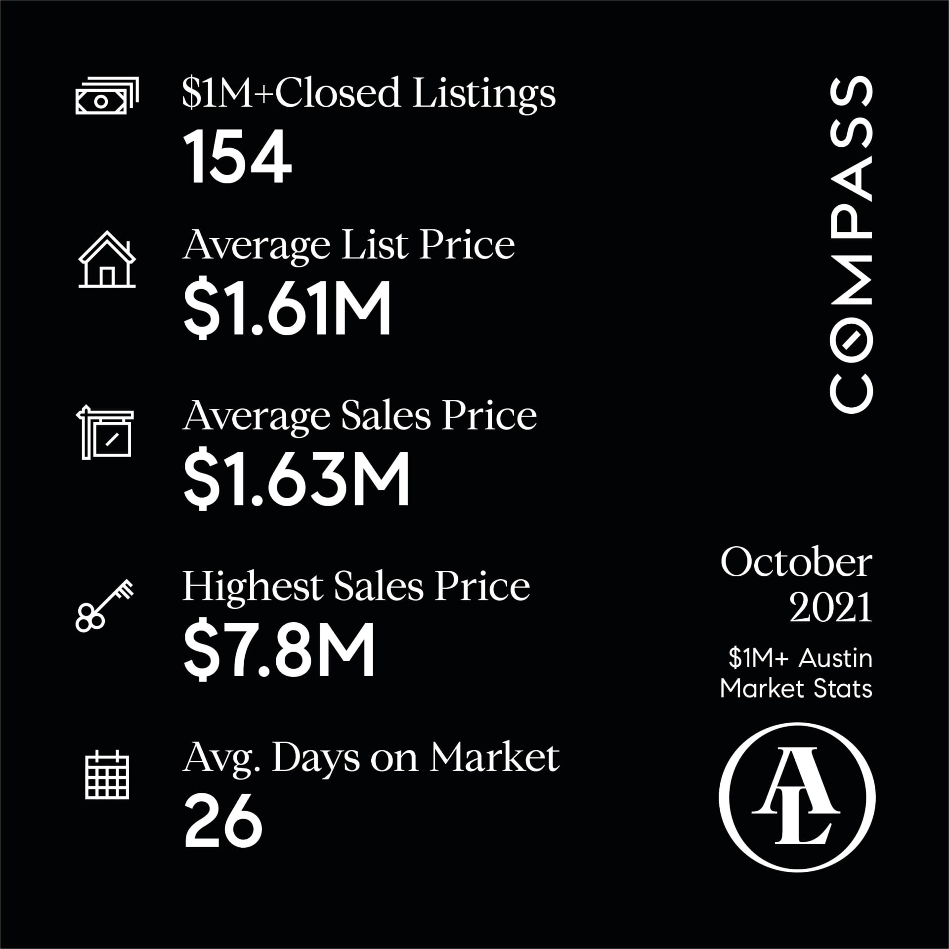 Austin's $1M+ Real Estate Market Stats October 2021: Luxury home sales remain strong in Austin- the average days on market decreased from 28 to 26 days from the previous month. This number was much higher last year at 69 average days on market! Are you thinking about selling? We can guide you through the process- Contact us today!