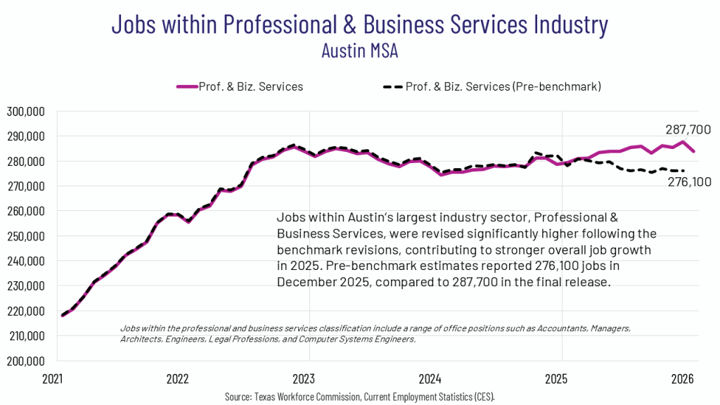 One industry that was impacted most by the revisions was Austin’s largest super sector, Professional & Business Services.[1] Professional & Business Services represents 20% of the payroll jobs in Austin with December 2025 employment originally estimated at only 276,100. With the revisions, this sector was now shown as having 287,700 jobs in December 2025. Growth in the sector was now 2.3% in 2025, which is a vast improvement over the -0.4% change that was originally estimated.