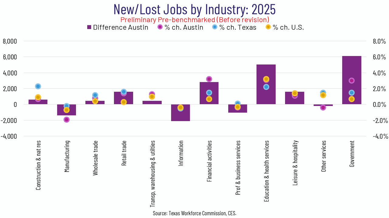 The animated graphic below compares preliminary and revised growth rates across major supersectors. Bars represent the number of jobs gained or lost in Austin during 2025, while dots show how Austin’s percent change compares to Texas and the U.S.