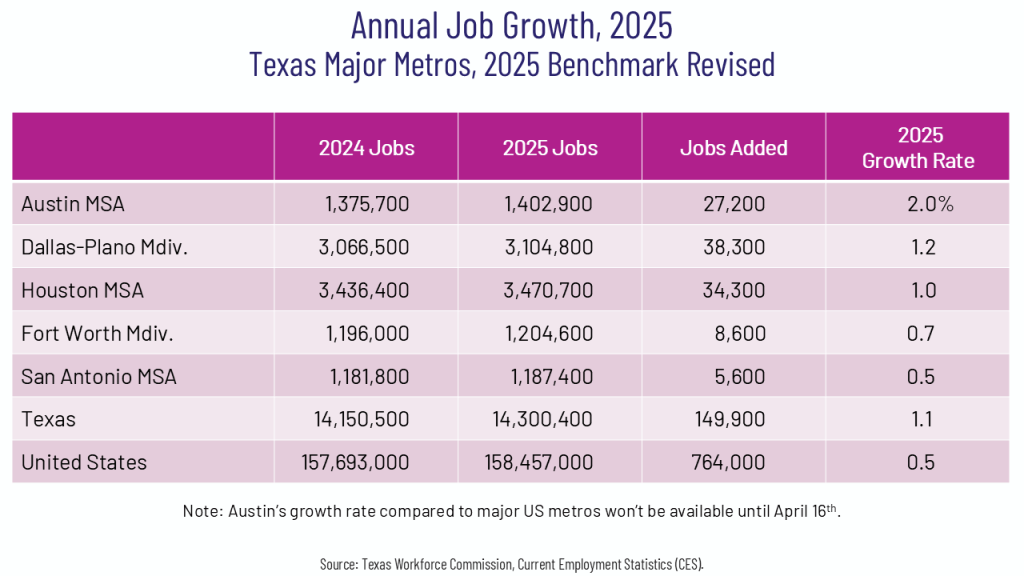 - Austin added 27,200 jobs in 2025, or 2.0% growth. Previous estimates pegged job growth at only 1.0%, or 14,100 jobs.