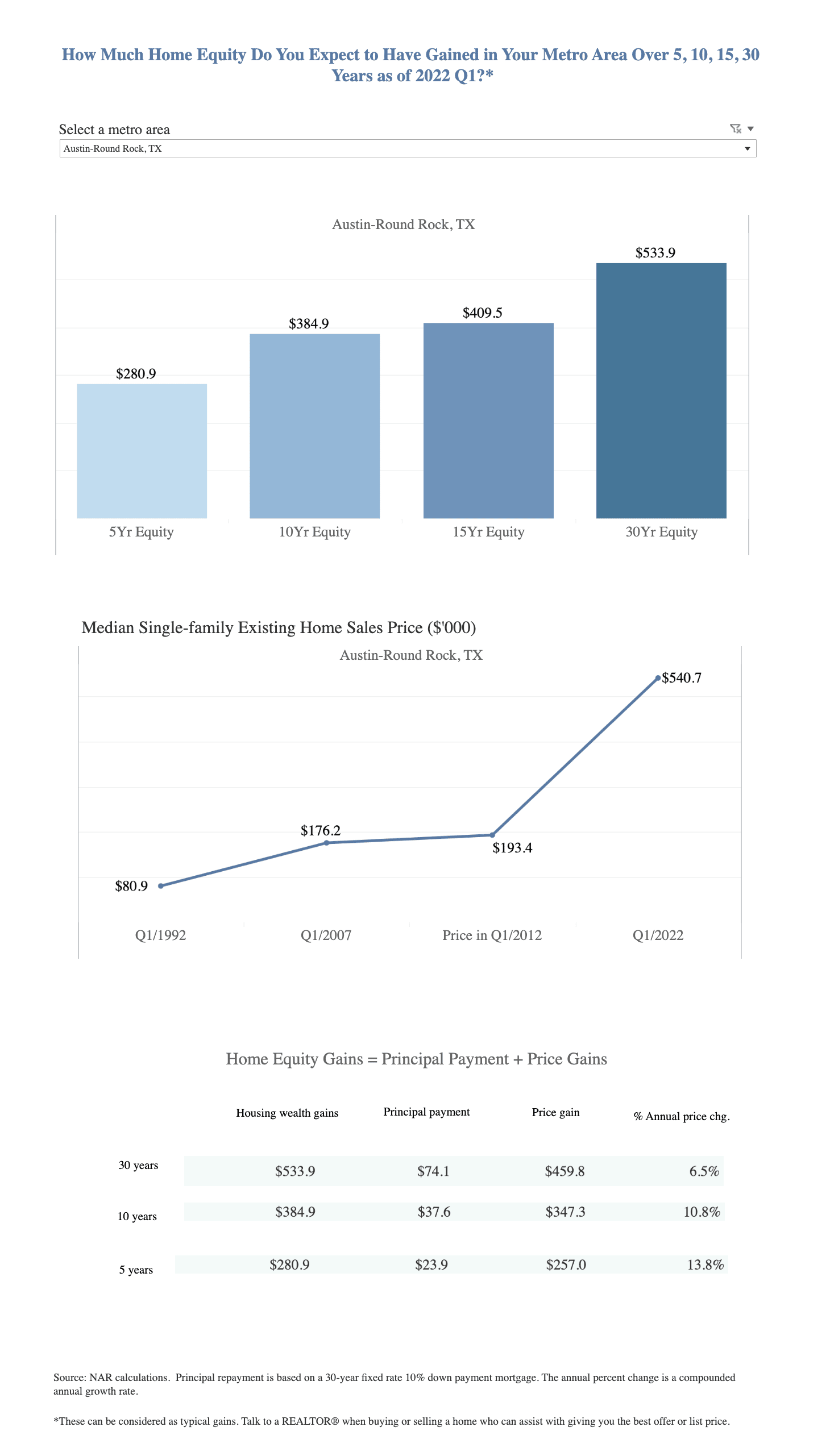 Over the past 10 years, at the national level, a homeowner who purchased a single-family existing home would have gained $229,400 in home equity if the home were sold at the median sales price of $360,700 in 2021 Q4. Home prices rose at a strong annual pace of 8.8%, yielding a pure gain due to a price appreciation of $209,400.