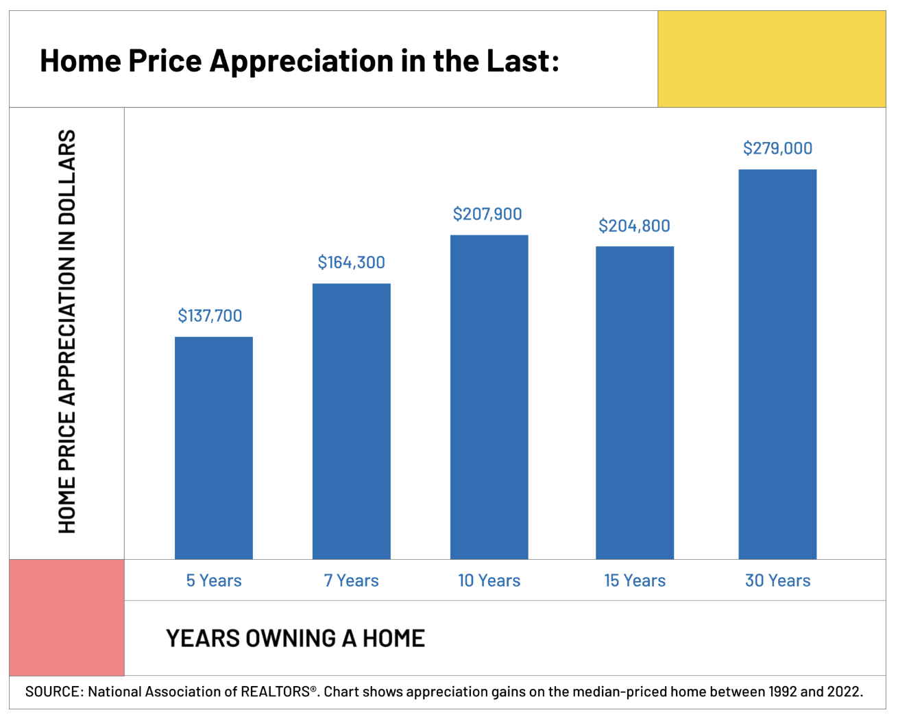 Although the market has experienced some turbulence, market fluctuations don’t erode the long-term advantages of home buying and selling. In fact, over the last 30 years, despite downturns in the market like the Great Recession, homes have continued to appreciate, according to NAR data.