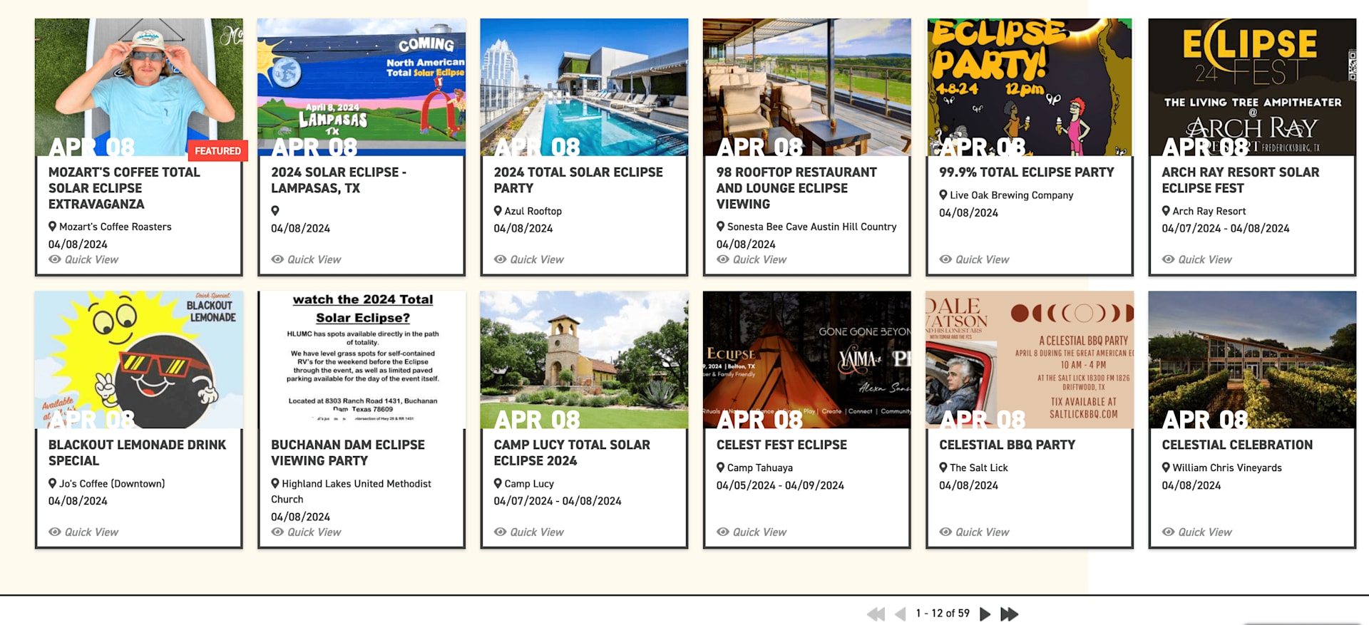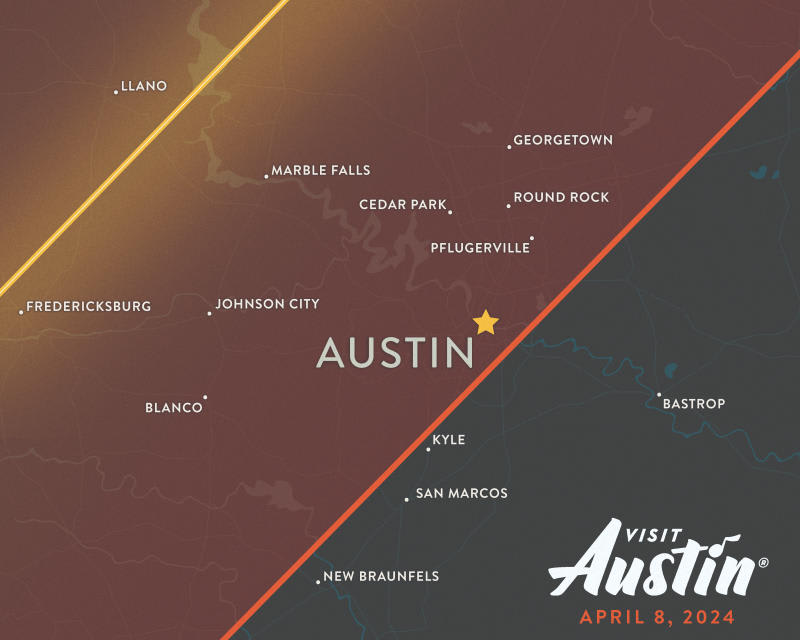 The eclipse will be visible throughout the Hill Country from 1:32 pm - 1:41 pm CST on April 8, 2024. Austin locals and visitors will experience about 1 minute and 46 seconds of the total solar eclipse at 1:36 pm CST.