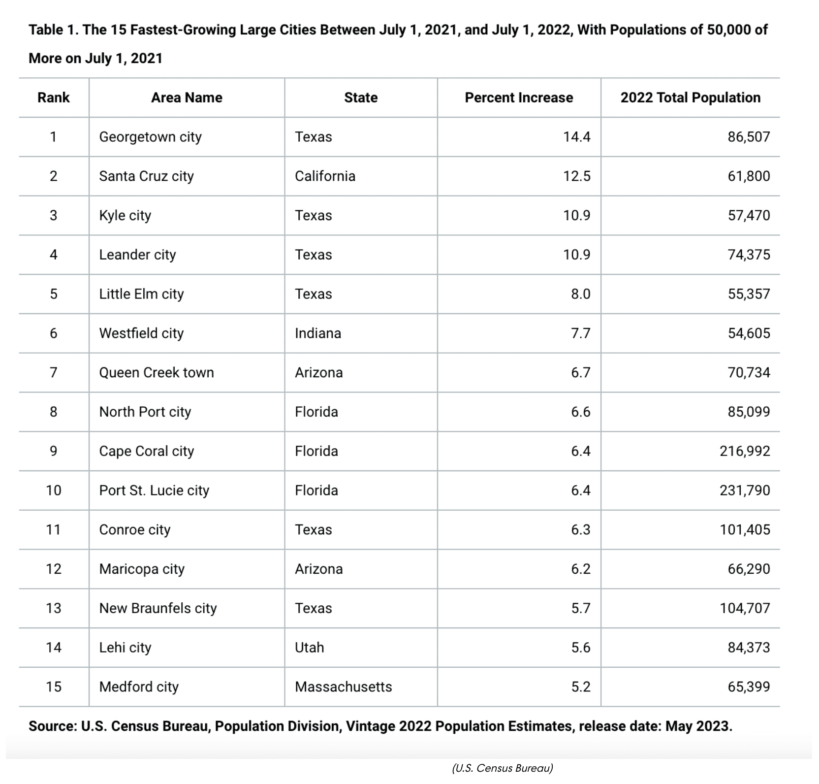 Central Texas grabbed the spotlight, as the three fastest-growing Texas cities were all on the outskirts of Austin. Georgetown led the list for the second year in a row, as its population swelled by 14.4 percent in 2022. Santa Cruz, California notched the number two spot, but after that came Kyle and Leander, each increasing its population by 11.9 percent.