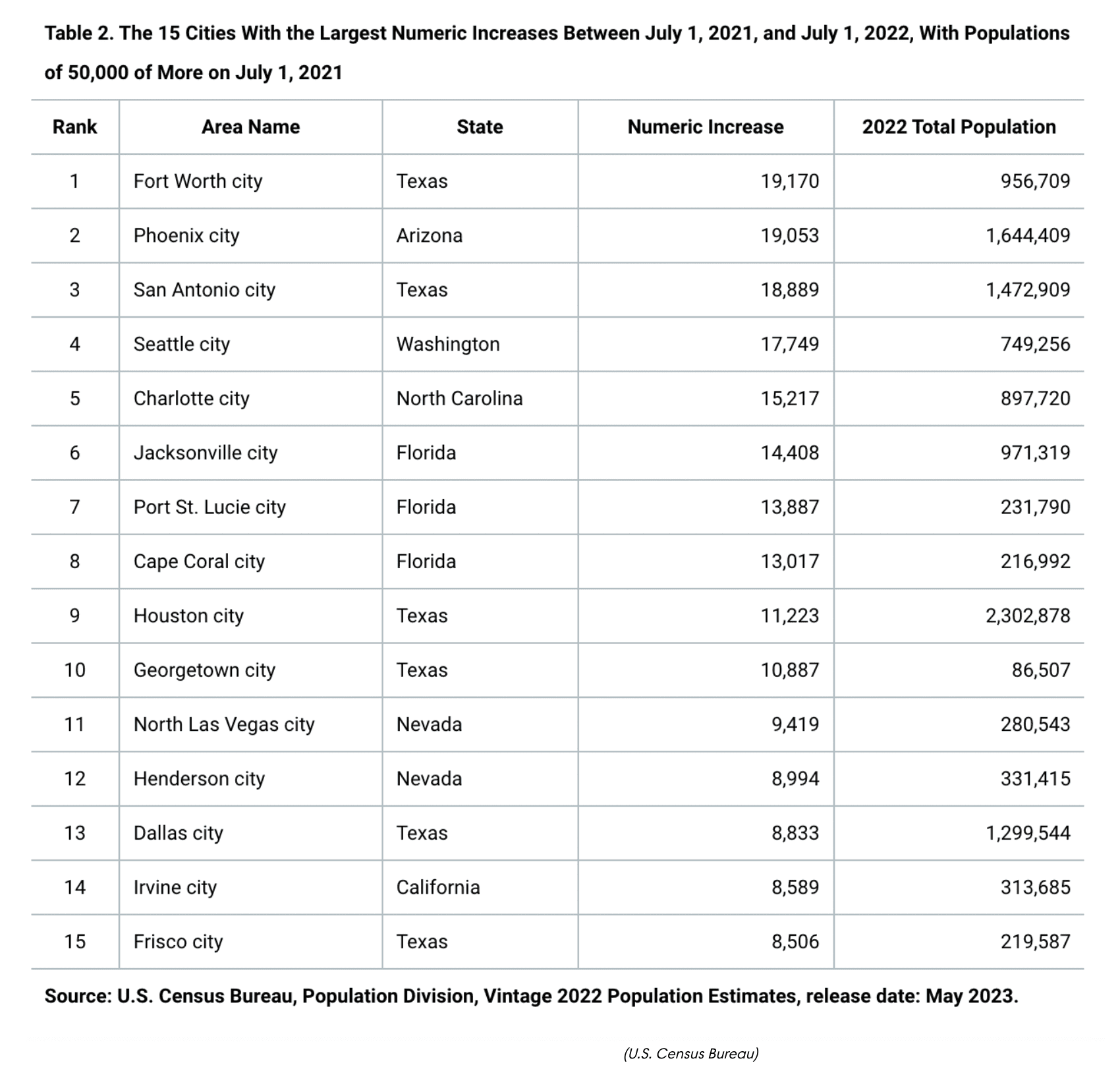 San Antonio grew rapidly as well. The city added 18,889 people last year, making it the third-fastest growing city in the country by pure volume.