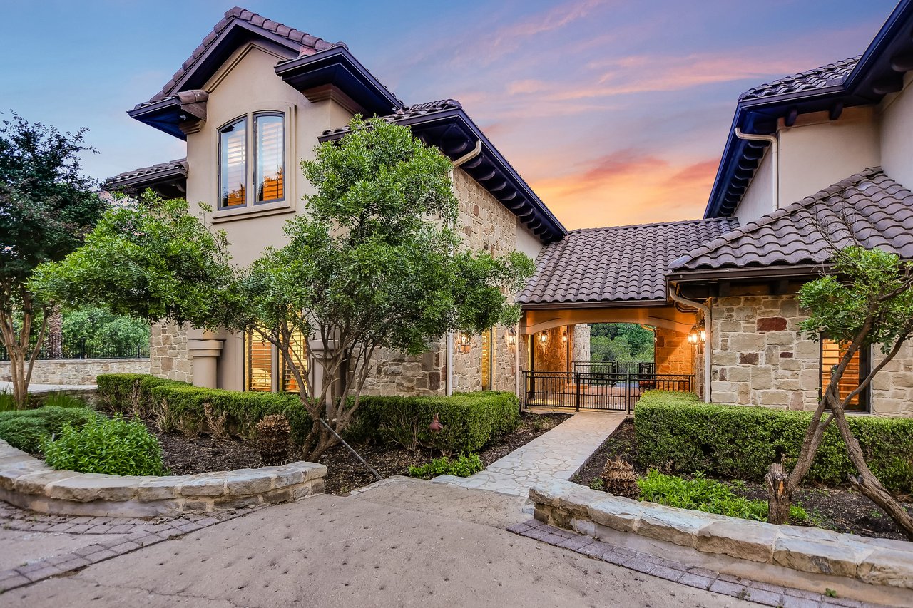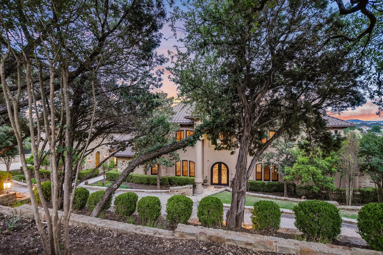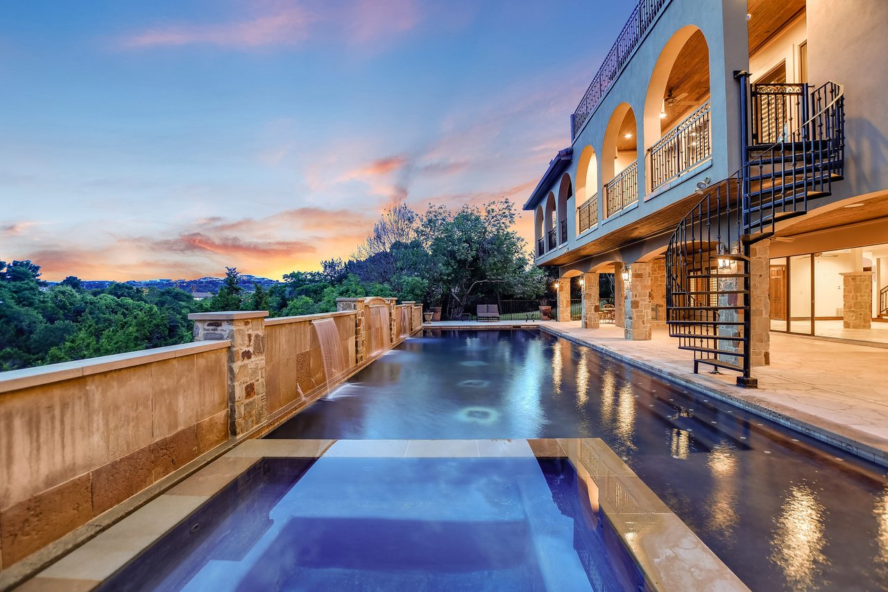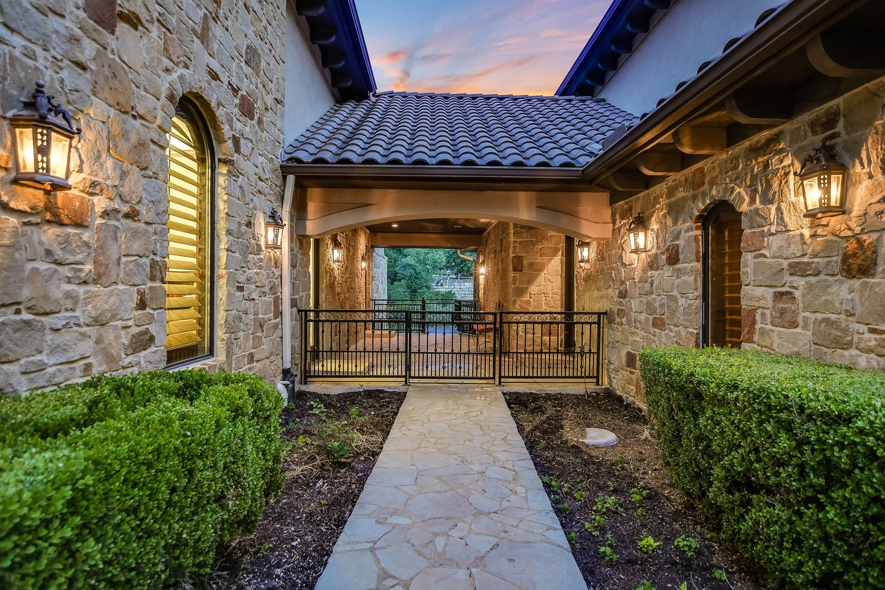 Nestled in the community of Lakeway/Rough Hollow, this Mediterranean Estate is designed to host & delight. The main residence has four bedrooms, a separate entrance guest apartment, Sport Court, resort-style pool & spa, 4-car + golf cart garage & so much more. Enter through the timeless iron doors into the main foyer to a welcoming and open floor plan with soaring ceilings and windows for plenty of natural light.