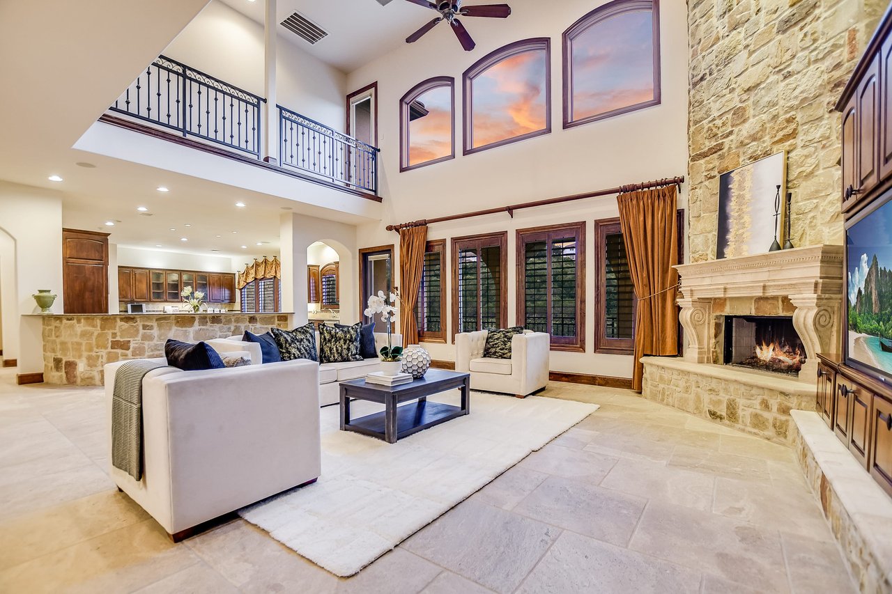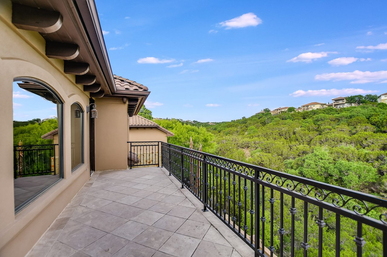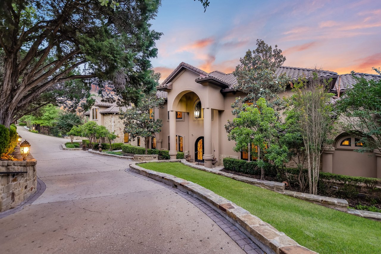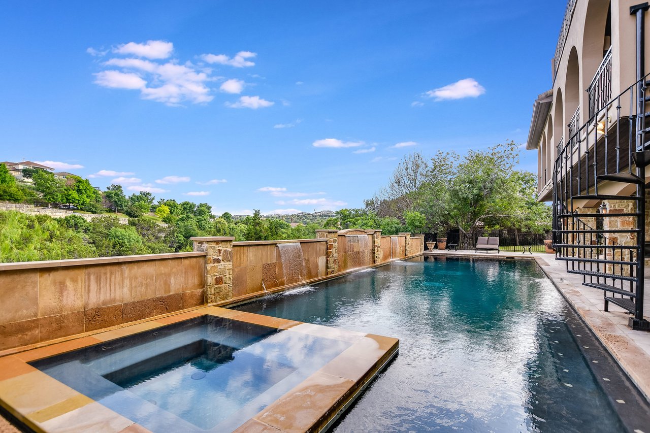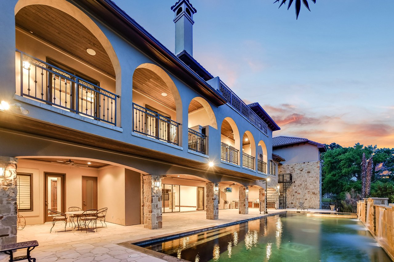 Nestled in the community of Lakeway/Rough Hollow, this Mediterranean Estate is designed to host & delight. The main residence has four bedrooms, a separate entrance guest apartment, Sport Court, resort-style pool & spa, 4-car + golf cart garage & so much more. Enter through the timeless iron doors into the main foyer to a welcoming and open floor plan with soaring ceilings and windows for plenty of natural light.