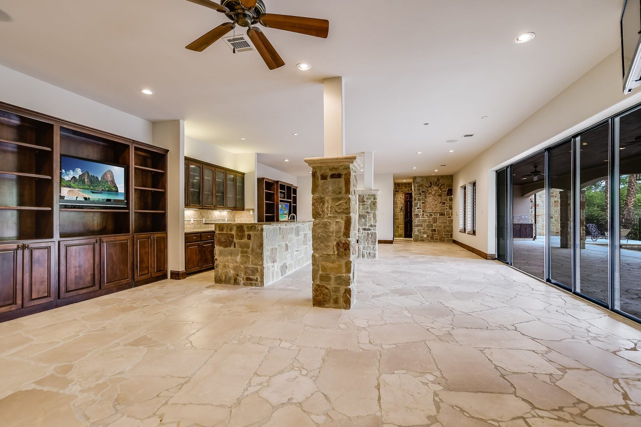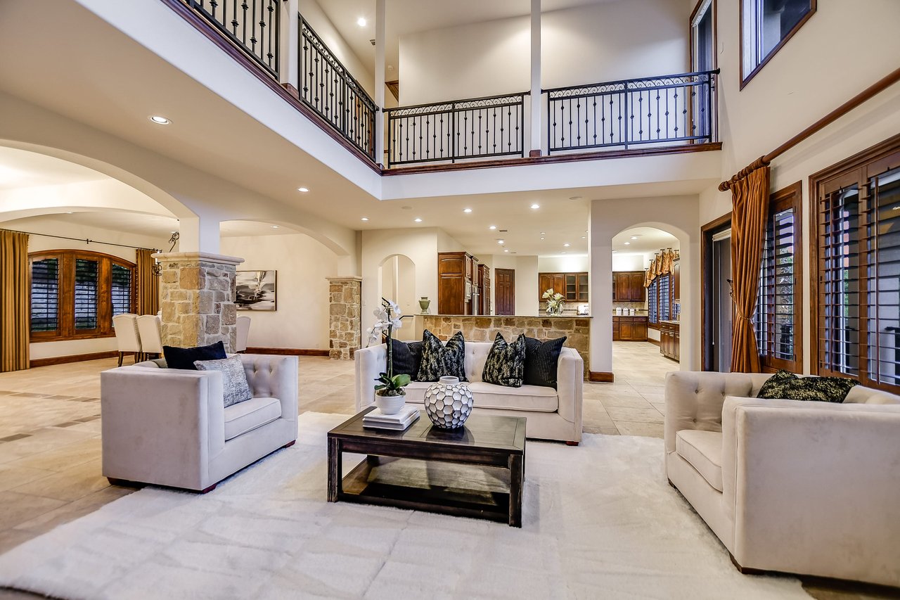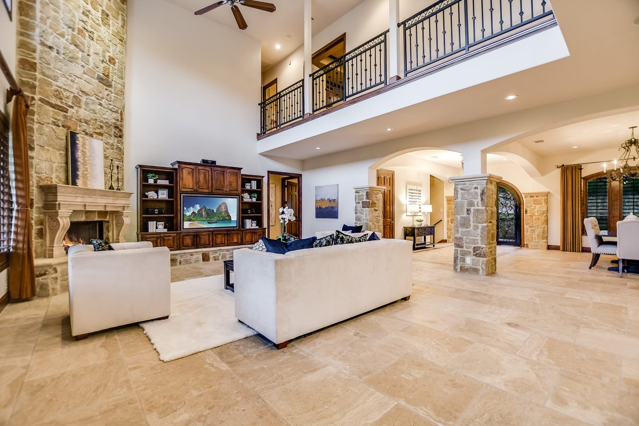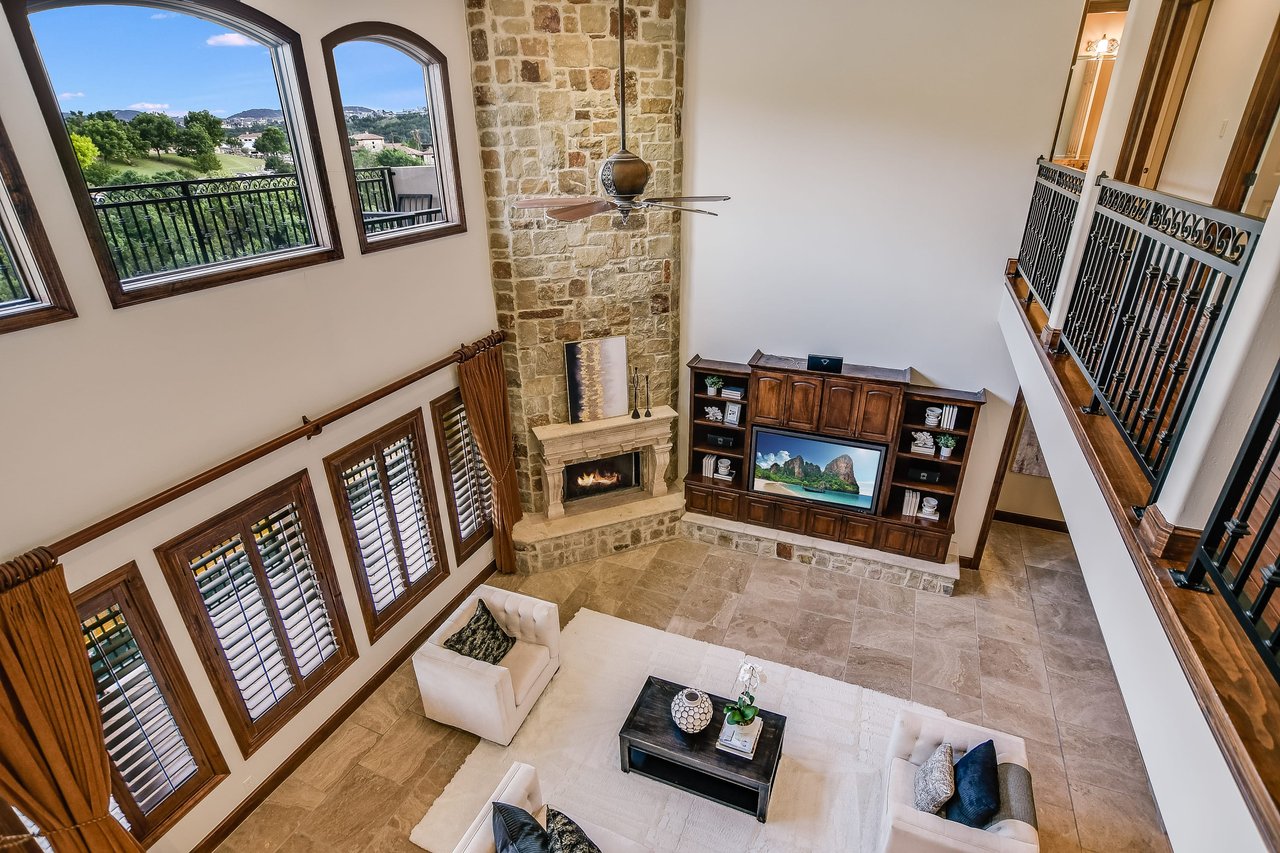 Nestled in the community of Lakeway/Rough Hollow, this Mediterranean Estate is designed to host & delight. The main residence has four bedrooms, a separate entrance guest apartment, Sport Court, resort-style pool & spa, 4-car + golf cart garage & so much more. Enter through the timeless iron doors into the main foyer to a welcoming and open floor plan with soaring ceilings and windows for plenty of natural light.