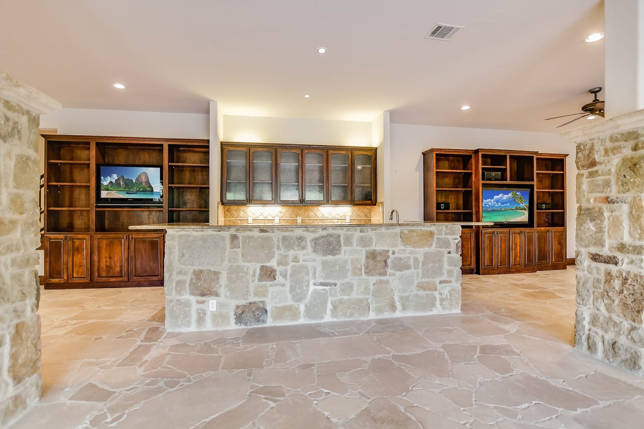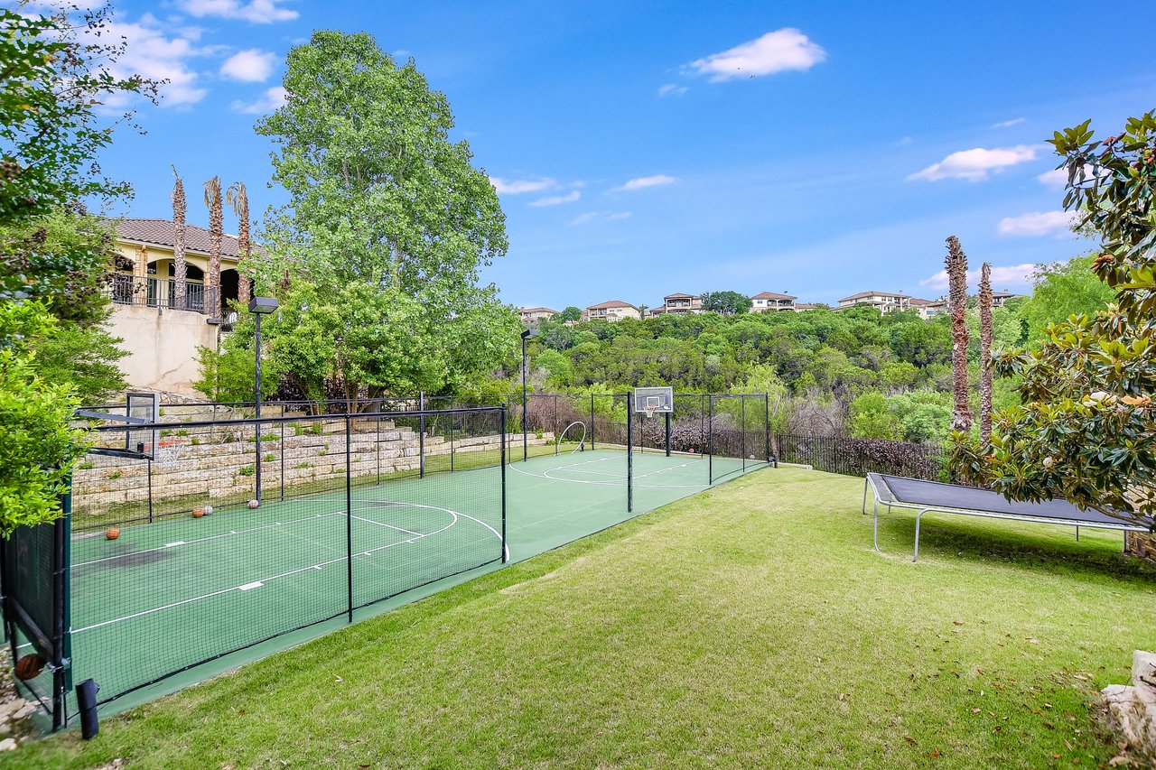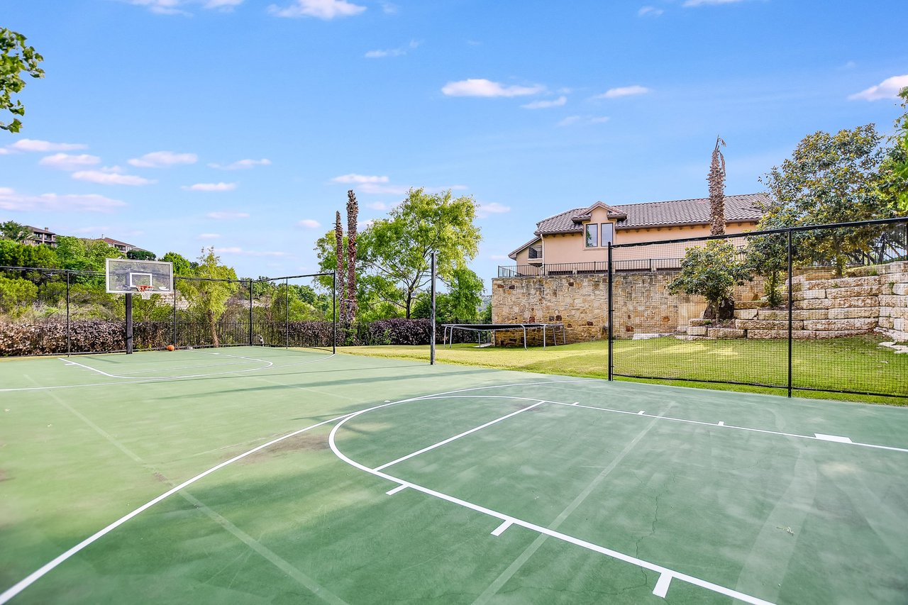 Main level offers Owner’s Suite, spacious and well-equipped kitchen, dedicated office (could be converted to a nursery). Secondary bedrooms are located on the upper-level with a media/flex room; and, lower-level offers spacious game room with wet bar, storage for entertaining, a wine cellar, and private guest suite, all with direct access to the covered terrace & pool/spa. Continue the outdoor fun and enjoy the sport court and additional yard space.